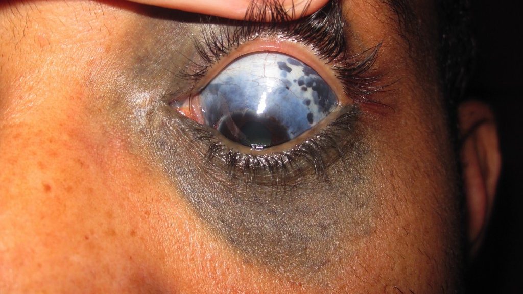 - Forma cutânea – Pigmentação azulada ou acinzentada na pele ao redor dos olhos e no rosto.