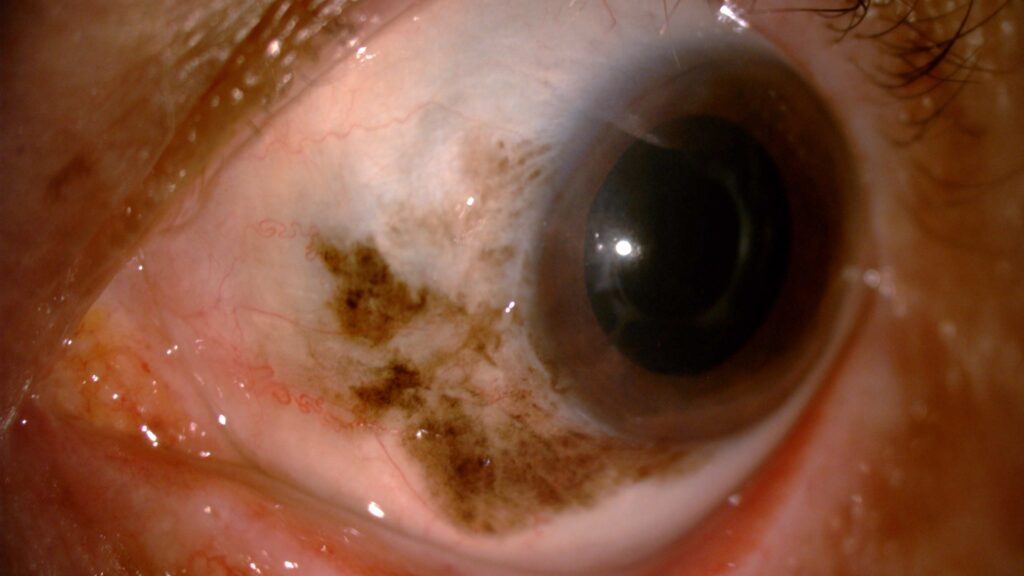 A Melanose Primária Adquirida (PAM) é uma condição caracterizada pelo aparecimento de manchas marrons na conjuntiva, que podem se desenvolver ao longo do tempo. Embora muitas vezes seja benigna, a PAM pode evoluir para um melanoma de conjuntiva, um tipo de câncer ocular, exigindo acompanhamento oftalmológico regular.